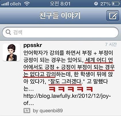 글쓴이는 “언어학자가 강의를 하면서 부정+부정이 긍정이 되는 경우는 있어도 세계 어디 언어에서도 긍정+긍정이 부정이 되는 경우는 없다고 강의하는데 한 학생이 뒤에 앉아 있다가 ‘잘도 그러겠다’고 말했다”는 에피소드를 소개했다.