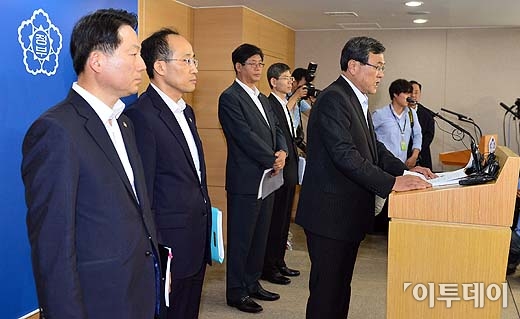 최문기 미래창조과학부 장관이 5일 오전 서울 세종로 정부서울청사에서 ‘관계부처 합동 창조경제 실현계획’을 발표하고 있다. 방인권 기자 bink7119@