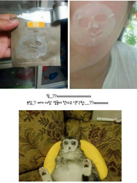 사진 주인은 "저게 사람 얼굴에 맞다고 생각함?"이라며 자신의 애완묘에 직접 씌운 모습을 따로 공개했다. 사람처럼 드러누운 고양이가 팩을 쓰고 있는 모습이 웃음을 자아낸다.