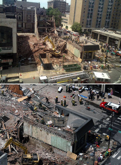 5일(현지시간) 미국 필라델피아 중심가에서 철거 작업중이던 4층 건물이 무너져내려 당국이 수색 작업을 벌이고 있다. 이 사고로 6명이 숨지고 최소 13명이 부상자가 발생했다.