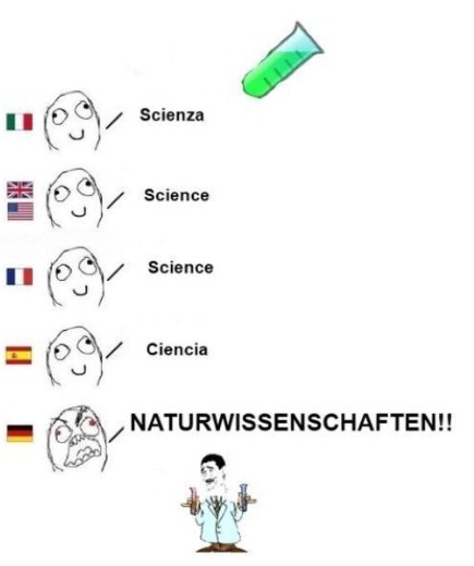 과학은 영어로 ‘science’, 이탈리아어로는 ‘scienza’, 스페인어로는 ‘ciencia’이다. 그러나 독일어에서는 ‘Naturwissenschaften’라고 적혀 있어 '독일어의 위엄'을 자랑하고 있다.