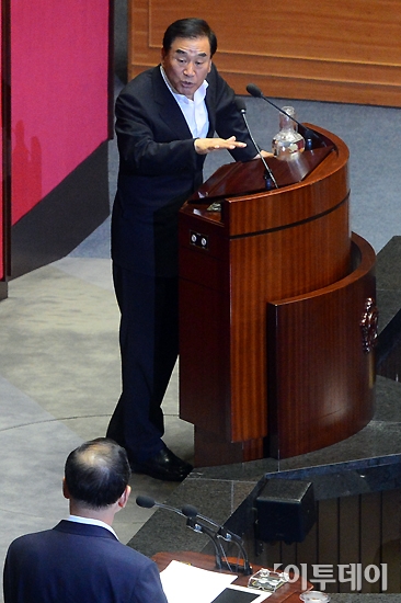 이재오 새누리당 의원이 10일 오전 국회에서 열린 제316회 국회 임시회 4차 본회의에 참석해 정홍원 국무총리에게 대정부 질의를 하고 있다. 노진환 기자 myfixer@