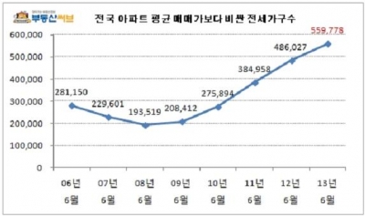 전국 아파트 평균 매매가보다 비싼 전셋집은 총 56만 가구에 이르는 것으로 나타났다.