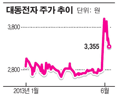 한편 대동전자의 주가는 5월 말 급등세 이후 조정을 받아 11일 현재 3355원으로 5월 말 종가 4000원보다 16.1% 내렸다.
