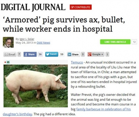 칠레 현지 언론은 돼지 한 마리가 빌라리카 지방 근처에 있는 리우리우 지역에서 총에 맞고도 기적처럼 죽지 않았다고 보도했다.
