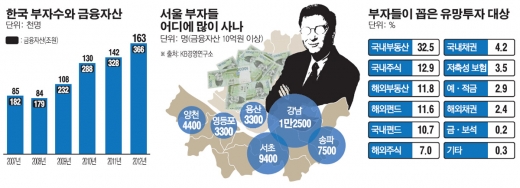서울이 7만8000명으로 전국 부자 수의 48%를 차지한 가운데 인구 대비 부자 수 비율도 0.77%로 가장 높았다. 하지만 2009년 이후 한국 부자 수는 연평균 14.9% 증가한 반면, 서울은 13.7% 증가해 전국 평균보다 낮은 증가율을 보였다.