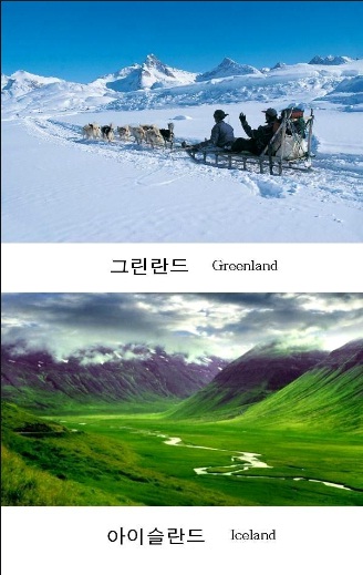 공개된 사진은 그린란드(Greenland)와 아이슬란드(Iceland) 풍경이다. 그러나 영어 뜻대로 하면 그린란드는 푸른 잔디가 펼쳐진 대지가 떠오르지만 얼음으로 뒤덮인 설원의 장관이 펼쳐진다.