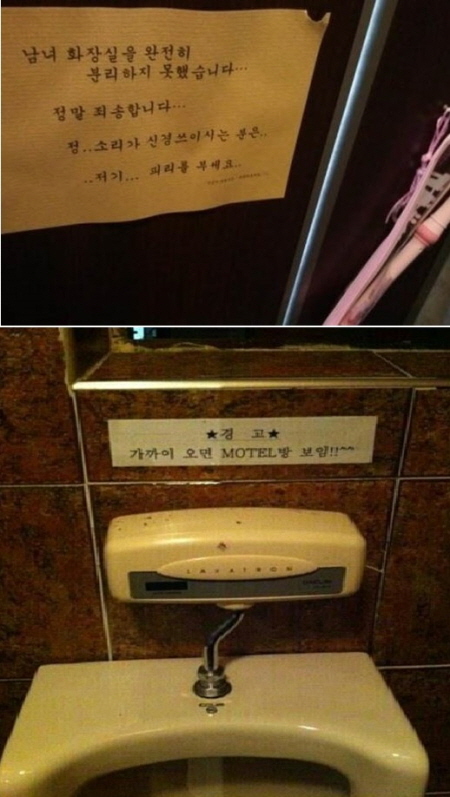 또 다른 사진에는 "가까이 오면 모텔 방이 보입니다"라는 문구가 소변기 위에 붙어 있다. 소변의 이물질이 튀지 않게 하기 위한 청소 아줌마의 '아이디어 문구'였던 것이다.