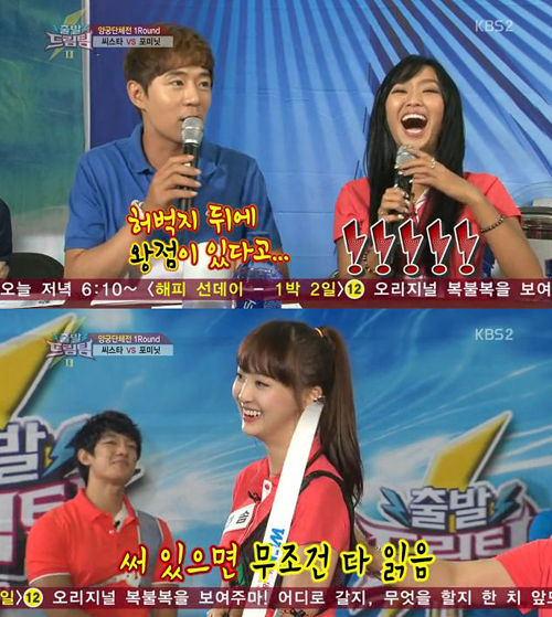 이날 첫 주자로 나온 막내 다솜은 마음을 가다듬으며 활을 들었다. 이 때 MC 붐은 "다솜이 허벅지 뒤에 왕점이 있다고..."라고 말했고, 함께 MC를 보던 씨스타 멤버 효린은 웃음을 감추지 못했다.