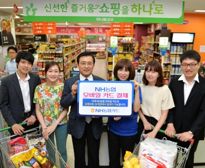 NH농협카드는 스마트폰 활용이 많은 고객 편의를 위해 하나로클럽 양재점 등 농협유통 24개 매장에 모바일카드 결제시스템을 구축했다고 17일 밝혔다. 이에 따라 농협유통 매장을 이용하는 고객들은 결제 시 일반카드는 물론 모바일카드도 자유롭게 사용할 수 있게 됐다.
