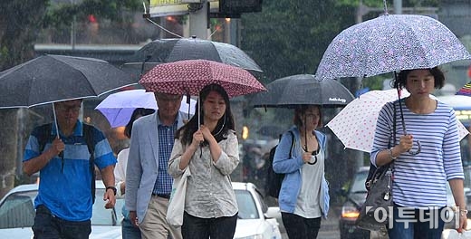 전국에 장맛비가 내리는 18일 오전 서울 광화문네거리에서 시민들이 우산을 쓰고 출근 발걸음을 재촉하고 있다. 방인권 기자 bink7119@