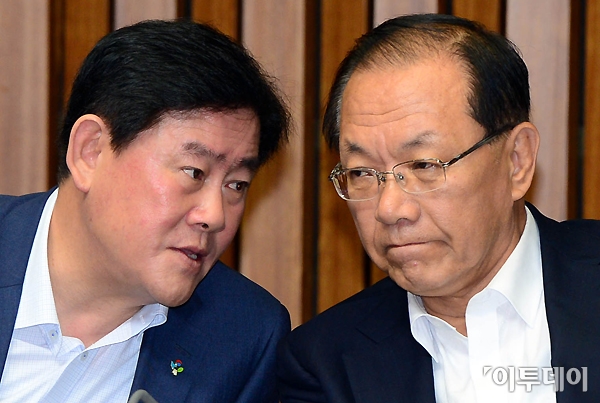 황우여 새누리당 대표와 최경환 원내대표가 19일 오전 여의도 국회에서 열린 최고중진연석회의에 참석해 이야기를 나누고 있다. 노진환 기자 myfixer@