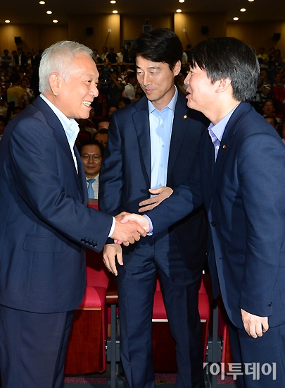 안철수 무소속 의원과 김한길 민주당 대표가 19일 오후 국회 의원회관 대회의실에서 열린 안 의원의 싱크탱크인 ‘정책네트워크 내일’ 창립기념 심포지엄에 참석해 인사를 나누고 있다. 노진환 기자 myfixer@