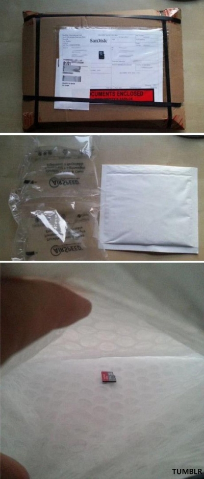 이 사진은 총 3장으로 택배로 배송된 A4용지 크기의 박스와 손바닥 크기의 진공포장 팩, 그리고 최종 결과물인 손톱 크기의 마이크로 메모리 카드의 모습이 차례로 담겨 있다. 말 그대로 과대 포장 끝판왕인 것.
