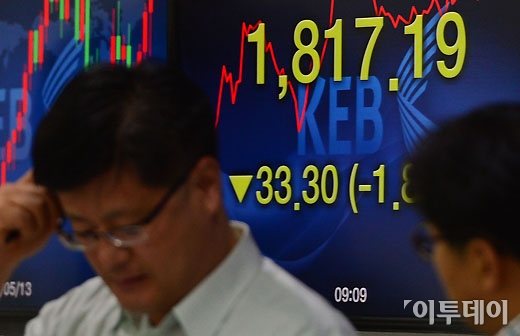 버냉키 쇼크의 여파로 20일 코스피가 연중 최저치를 기록했던 어제보다 44.09포인트, 2.38% 하락한 1,806.40으로 장을 시작했다. 이날 서울 명동 외환은행 본점 딜링룸 전광판의 코스피 지수가 1817.19를 기록하고 있다. 양지웅 기자 yangdoo@