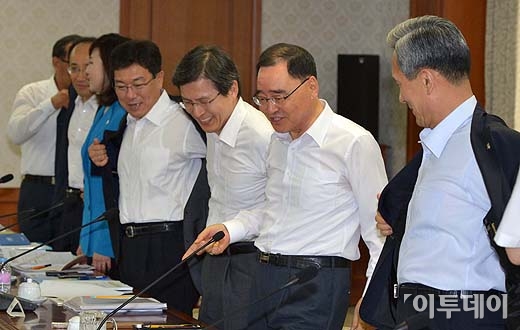 정홍원 국무총리와 국무위원들이 21일 오전 서울 세종로 정부서울청사에서 열린 ‘국가정책조정회의’에서 상의를 탈의 하고 있다. 방인권 기자 bink7119@
