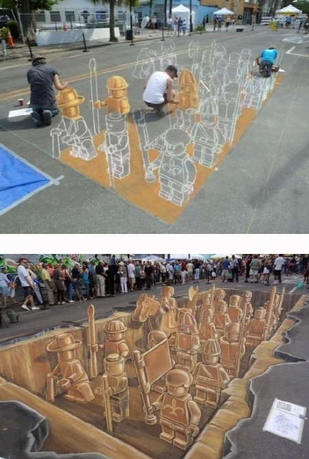 사진 속에는 길거리에 분필로 그린 작품들이 담겨 있다. 길거리에 장난감 병정들이 나란히 서있는 모습을 표현하는가 하면 건물 계단도 사실감 있게 그려냈다. 3D 영상을 연상케 하는 입체감에 작품들은 보는 이들로 하여금 감탄을 자아냈다.
