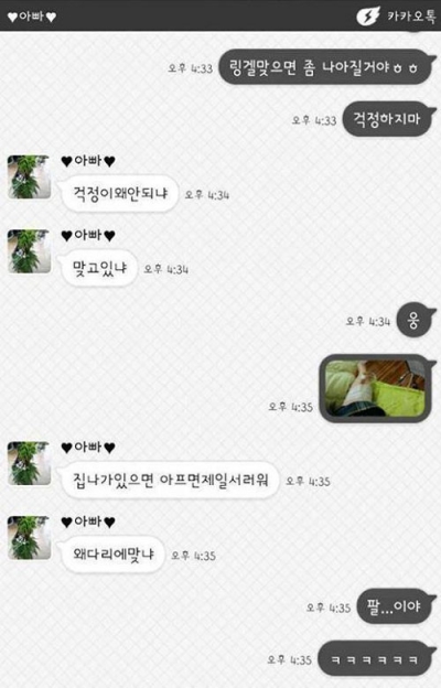 캡처된 화면 속 딸은 병원에서 링거를 맞고 있는 사진을 아빠에게 전송했다. 그러자 아빠가 "왜 (링거를) 다리에 맞냐"고 반문한다.
