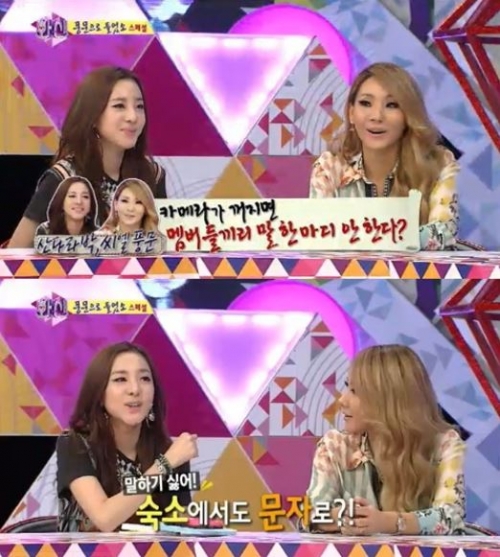 산다라박은 "낯을 가려서 남한테 피해 주는걸 싫어한다"며 "할 말 있을 때 노크를 못 하겠더라. 자는데 깰까봐 밖에서 냄비를 치기도 한다"고 털어놨다. 이에 씨엘은 "언니는 말을 시키는게 어색한거다"고 덧붙였다.