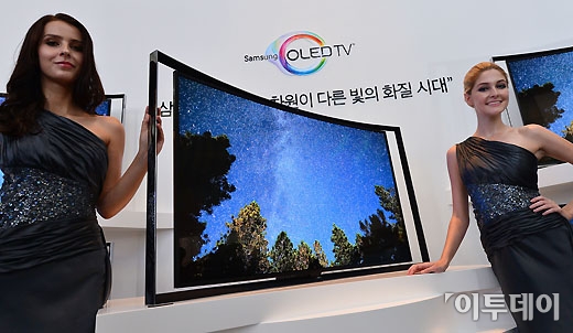 삼성전자가 27일 서울 서초동 사옥에서 새롭게 출시된 '55인치 커브드 OLED TV'를 선보이고 있다. 이날 선보인 커브드 OLED TV는 이날부터 전국 주요 매장에서 판매되며 가격은 출고가 기준 1500만원으로 LG전자의 곡면 OLED TV와 같은 가격이다. 양지웅 기자 yangdoo@
