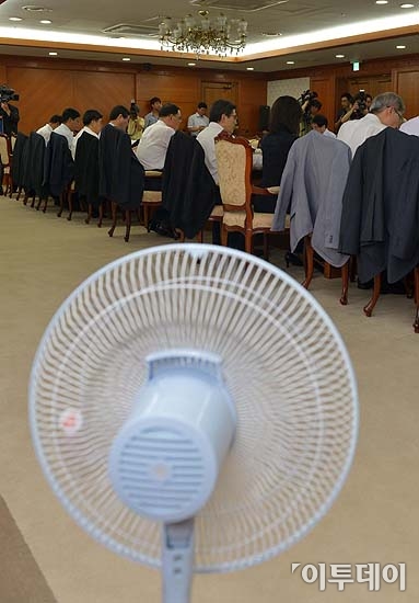 정홍원 국무총리와 국무위원들이 28일 오전 서울 세종로 정부서울청사에서 열린 ‘국가정책조정회의’에서 선풍기를 틀고 회의를 하고 있다. 방인권 기자 bink7119@