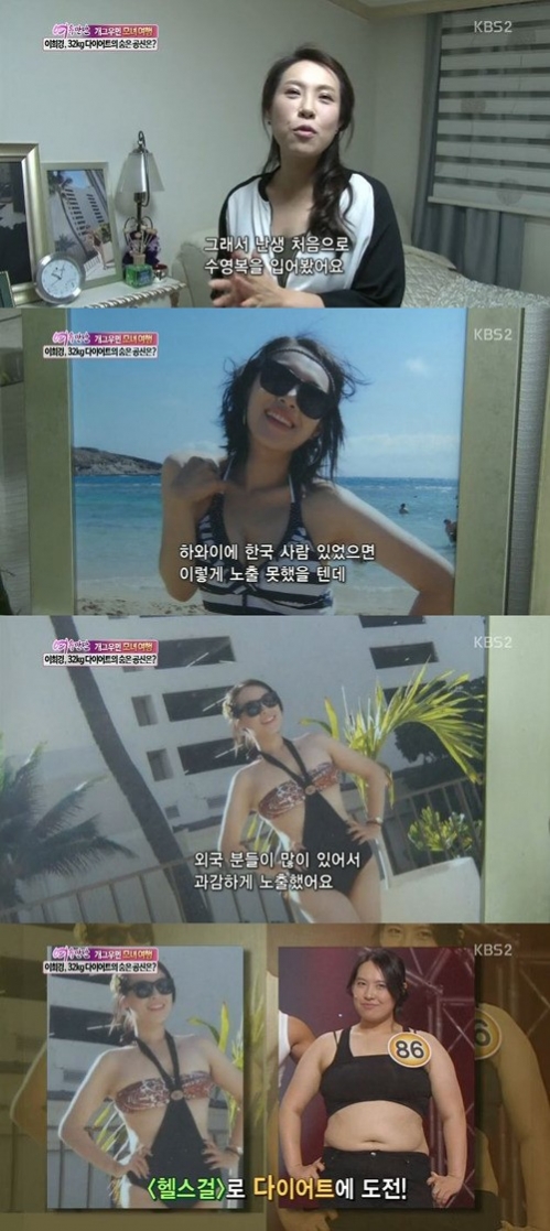 화면을 통해 잠시 소개된 사진 속 이희경은 하와이 해변에서 에스닉풍의 비키니를 입고 한껏 포즈를 잡고 있다. 86kg일 때와 전혀 다른 굴욕없는 모습에서 자신감이 넘친다.