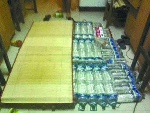 공개된 사진에는 물을 채운 페트병 위에 돗자리를 깔아 만든 침대가 담겼다. 이 침대는 중국 우한 대학교에 재학 중인 한 학생이 에어컨이 없는 기숙사에서 더위를 참다 못해 직접 만든 것으로 알려졌다.