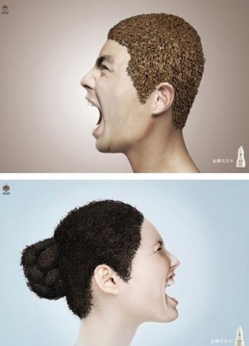 '무서운 샴푸 광고 2탄'에는 남자의 머리에 벌이, 여자의 머리에 개미떼가 뒤덮고 있어 흉칙한 느낌을 자아낸다.