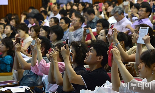 1일 서울 교육연구정보원에서 열린 '2014 대입 수시전형 대학별 설명회'에 참석한 교사들이 입시정보를 핸드폰으로 촬영하고 있다. 양지웅 기자 yangdoo@