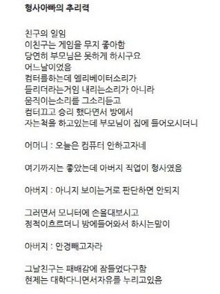 게시물 작성자는 아버지 직업이 형사인 친구가 어린 시절 몰래 컴퓨터 게임을 하다가 걸린 사연을 소개했다. 내용에 따르면 친구가 몰래 게임을 하다 부모님이 탄 엘리베이터 소리를 듣고, 컴퓨터를 끄고 자는 척을 했다.
