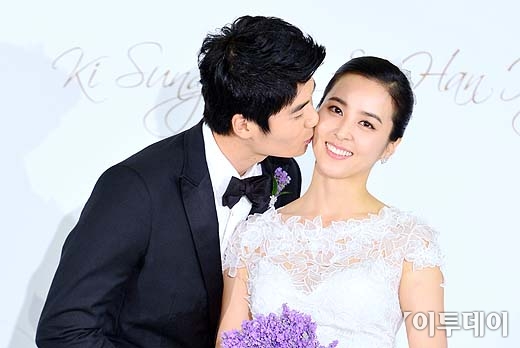 축구선수 기성용(24ㆍ스완지시티)과 배우 한혜진이 1일 오후 서울 강남구 삼성동 인터컨티넨탈 호텔에서 열린 결혼식 기자회견에서 입맞춤을 하고 있다. 방인권 기자 bink7119@