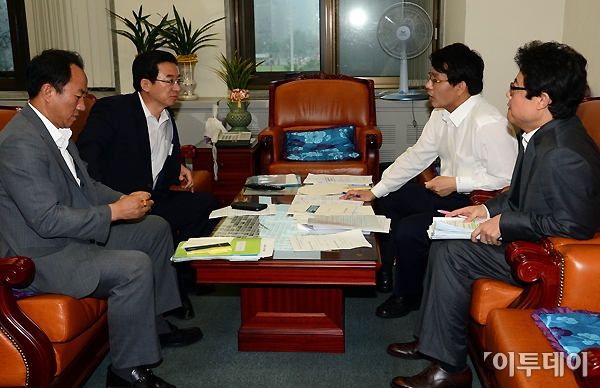 윤상현 새누리당 원내수석부대표와 정성호 민주당 원내수석부대표가 2일 오전 여의도 국회 새누리당 원내수석부대표실에서 회동을 갖고 있다. 노진환 기자 myfixer@