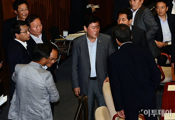 제316회 국회(임시회) 제10차 본회의가 2일 오후 국회 본회의장에서 열렸다. 최경환 새누리당 원내대표와 김무성 의원 등이 본회의장에서 이야기를 나누고 있다. 노진환 기자 myfixer@