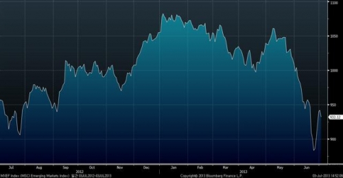 이머징마켓 증시는 지난달 벤 버냉키 연방준비제도(Fed, 연준) 의장의 출구전략 시사 발언 이후 약세를 면치 못하고 있는 상황이다. 5월 초 이후 MSCI이머징마켓인덱스의 낙폭은 11%에 달한다.