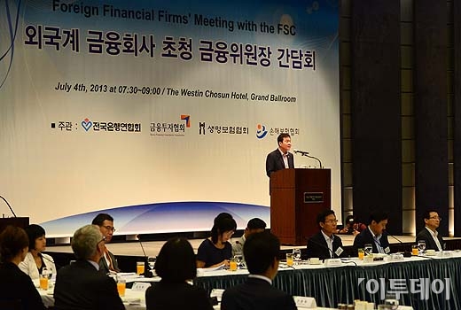 신제윤 금융위원장이 4일 오전 서울 중구 웨스턴 조선호텔에서 열린 ‘외국계 금융회사 초청 금융위원장 간담회’에서 인사말을 하고 있다. 방인권 기자 bink7119@
