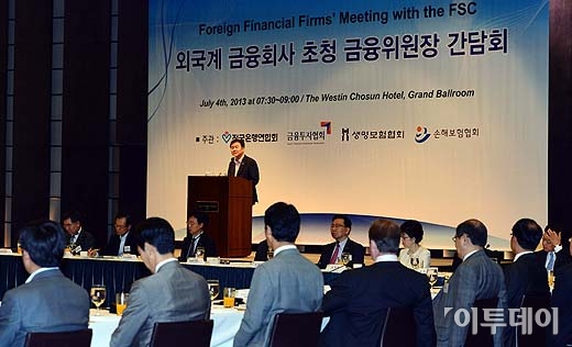 신제윤 금융위원장이 4일 오전 서울 중구 웨스턴 조선호텔에서 열린 ‘외국계 금융회사 초청 금융위원장 간담회’에서 인사말을 하고 있다. 방인권 기자 bink7119@
