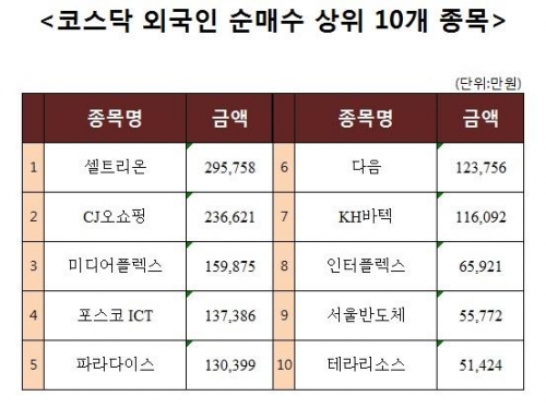 [코스닥 외국인 순매수 상위 10개 종목]
