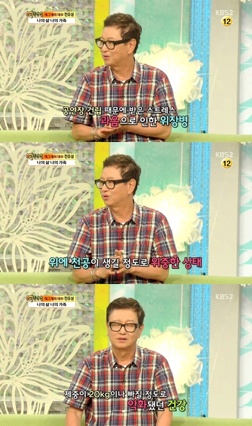 전유성은 "공연장을 하면서 스트레스, 술을 많이 마셔서 위장병을 앓았다. 위 천공으로 고생해 19.8kg이나 빠졌다“며 ”지금은 많이 회복해 배도 다시 나왔다"고 설명했다.