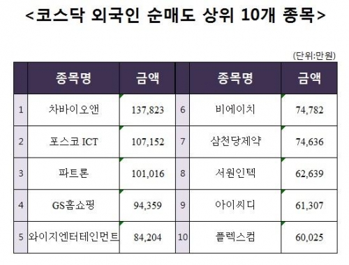 [코스닥 외국인 순매도 상위 10개 종목]