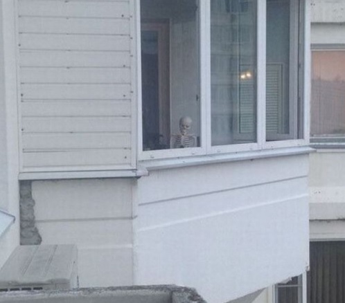 공개된 사진을 살펴보면 하얀색으로 꾸며진 이웃집 창가에 해골이 앉아서 앞집을 바라보고 있다.