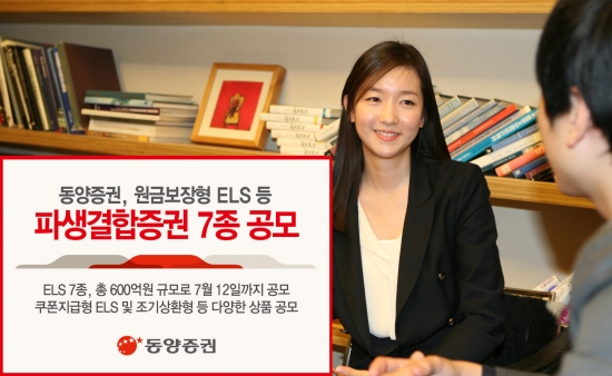 동양증권은 오는 12일까지 최고 45% 수익이 가능한 원금보장형 ELS를 비롯해 다양한 수익구조로 설계된 총 ELS 7종을 600억원 규모로 공모한다고 밝혔다.