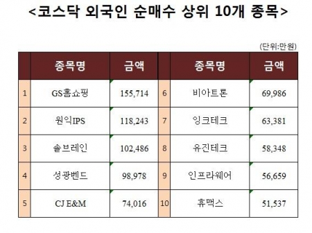 [코스닥 외국인 순매수 상위 10개 종목]