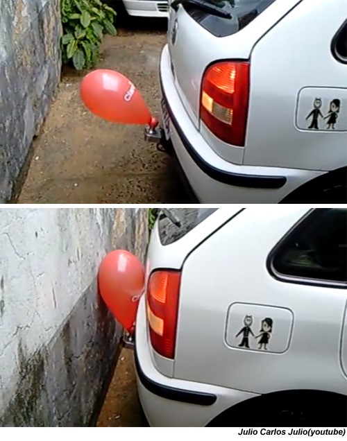 사진 속에는 후방감지 센서 대신 빨간색 풍선이 달린 자동차가 찍혀 있다. 자동차가 후진하다 벽에 닿아 풍선이 터지면 브레이크를 밟아 정지하는 것.