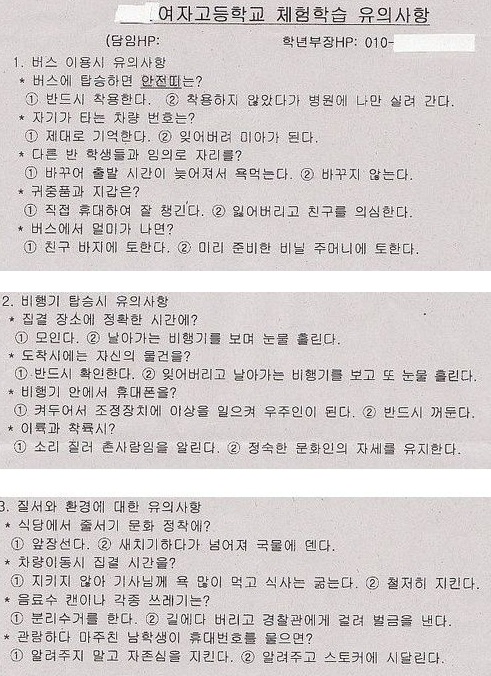 유인물에는 협박에 가까운 선생님의 전달사항이 담겨있다. 특히 비행기에 탑승할 시 정확한 시간에 집결하지 않으면 ‘날아가는 비행기를 보며 눈물 흘린다’는 내용은 폭소를 자아낸다. 귀중품과 지갑은 ‘직접 잘 챙긴다’ 또는 ‘잃어버리고 친구를 의심 한다’는 내용의 선택지도 눈길을 끈다.