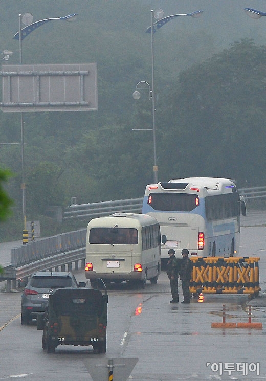 개성공단 정상화를 위한 남북 당국 간 회담이 10일 개성공단에서 열렸다. 남북실무회담 대표단 및 개성공단 관계 차량들이 파주 남북출입사무소를 통과하고 있다. 이번 회담은 3개월 이상 가동이 멈춘 개성공단 재가동의 분수령이 될 전망이다. 양지웅 기자 yangdoo@
