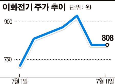 지난 10일 이화전기는 계열사 파산 신청이 악재로 작용하며 전일보다 117원(-12.65%) 급락한 808원에 장을 마쳤다.