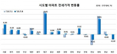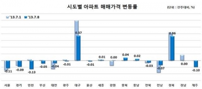 시도별로는 △인천(-0.13%) △서울(-0.11%) △제주(-0.10%) △경기(-0.09%) △전남(-0.07%) 등의 순으로 가격 하락을 주도했지만 대구(0.37%)와 경북(0.36%), 충북(0.04%) 등은 올랐다.