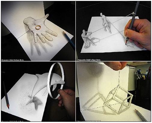 이번에 공개된 ‘연필로 그린 3D 그림’에는 링을 통과하는 돌고래, 반지를 들고 있는 손 등 연필로 그린 다양한 그림이 입체 효과를 보여주고 있어 놀라움을 자아낸다.