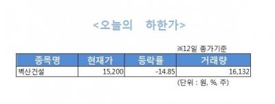 12일 국내 주식시장에서는 코스피시장 상장사인 벽산건설 한 종목만 하한가를 기록했다.