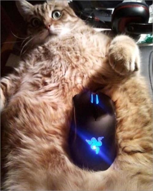 이 모습이 마치 고양이의 배를 마우스 패드로 사용한 것처럼 보인다. 이는 고양이 위에 쥐(마우스)를 올려 놓은 것으로도 해석할 수 있어 묘한 웃음을 줬다.